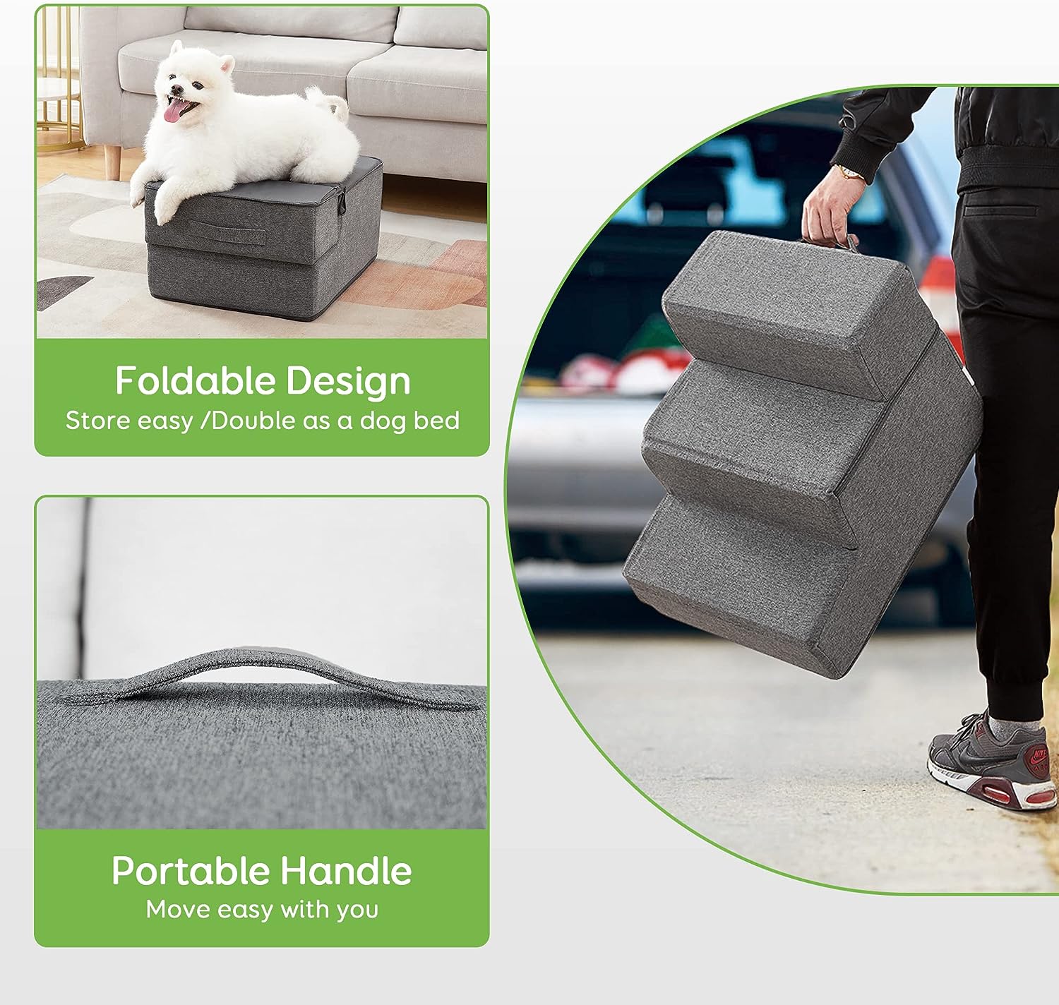 Foldable With Better Portability: Move the steps at ease with the handle. Fold it up for storage or in the trunk. It also makes a sweet dog bed away from home, allowing you to travel with your dogs cats paw buddies less of a hassle, more of a breeze